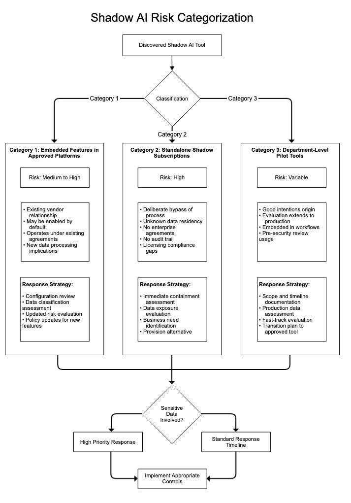 Traditional shadow IT governance assumes technology enters through procurement channels. Shadow AI requires broadening our definition of what constitutes a new capability requiring governance oversight.