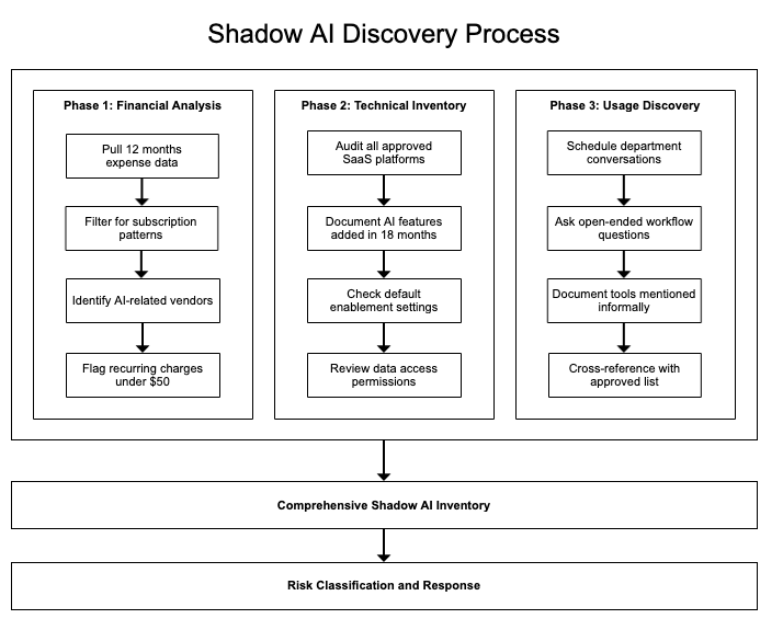 Shadow AI discovery often occurs through incident response rather than proactive monitoring. A vendor security questionnaire reveals undocumented AI tools. An audit uncovers unapproved subscriptions, but a data breach at an AI vendor prompts review of what tools are actually in use.